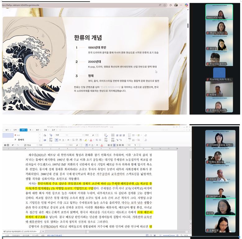 한국베트남학회가 주관한 ‘2025년 정기 학술대회’가 2025년 9월 20일(토) 오후 1시 30분부터 5시까지 온라인(Zoom)으로 성공적으로 개최되었습니다. 이번 학술대회는 총 4개의 세션으로 구성되었으며, 다음과 같은 주제를 중심으로 진행되었습니다. (1세션: 한‒베 정치‧경제 협력의 회고와 전망, 2세션: 한‒베 교육‧인문 교류의 회고와 전망,